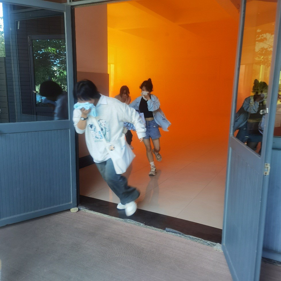 随着警报铃声拉响,生物实验楼内烟雾四起,消防演练拉开序幕,在老师们有序的组织下,员工们都用湿毛巾捂住鼻子和嘴巴,小步弯腰快走,向操场疏散,全体师生在较短的时间内,安全、有序、镇定、快速地到达疏散集合地(生物实验楼前操场)。在整个疏散过程中做到了师生配合默契、疏散路线清楚、组织有条不紊、人人各尽其责。消防应急演练取得圆满成功。