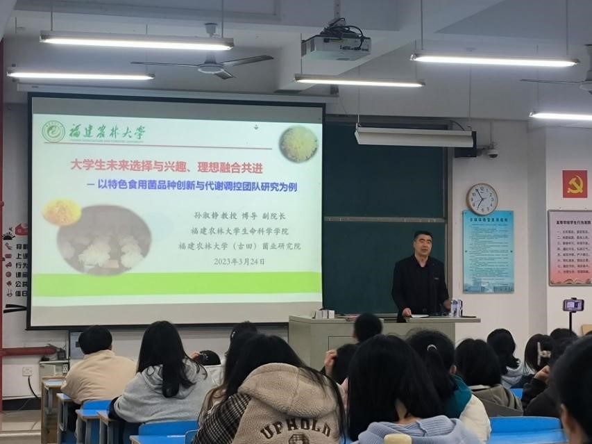 孙淑静教授首先介绍了福建农林老员工科院整体情况,随后以自己所在的课题组特色食用菌品种创新与代谢调控团队为例,引导同学们以培养学科兴趣为主,参与教师科研,在为企业解决行业难题的时候发掘科学问题,深入探索,个人发展与企业共成长,希望同学们在兴趣中学习,在学习中找到目标和理想。
