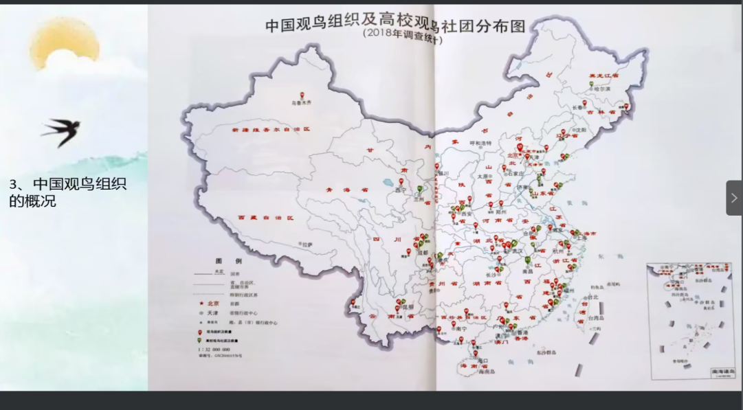 首先,江文展示了古代画家关于鸟的绘画作品,表现了中国人自古以来对于鸟类的喜爱。并介绍了鸟类动物对于自然生态世界的作用。他提到:“即使现在自然界仍拥有丰富的鸟类资源,但鸟类灭绝的速度不可小觑。世界自然保护联盟将物种的受胁程度分为CR、EN、VU、NT、LC、DD这六类。”由此,抛出了“如何保护鸟类资源”这一问题并给出了对应解释。