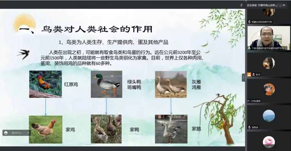 为呼吁同学们爱护鸟类,提高同学们环保意识,自然坊社团于2022年12月10日举办了线上《中国观鸟活动发展历程和高校观鸟组织的现状》讲座。本次主讲人邀请宁德市岚山自然生态研究保护中心负责人江文。