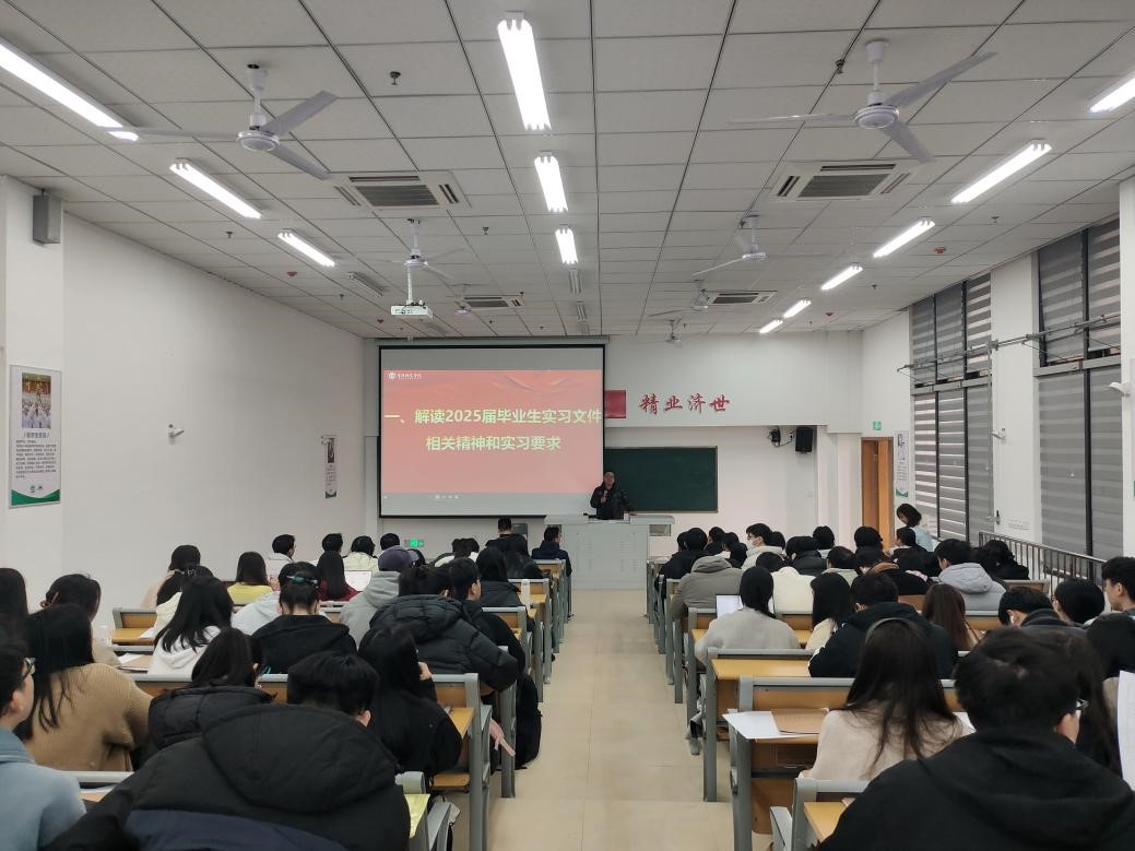 会上,刘春雷老师解读2025届毕业生实习文件相关精神和实习要求,包括实习时间、实习地点、实习材料撰写要求等,确保每位毕业生都能了解自己的职责和任务。同时,他还介绍学院已合作的实习单位情况,帮助毕业生们更好地了解并选择适合自己的实习岗位。