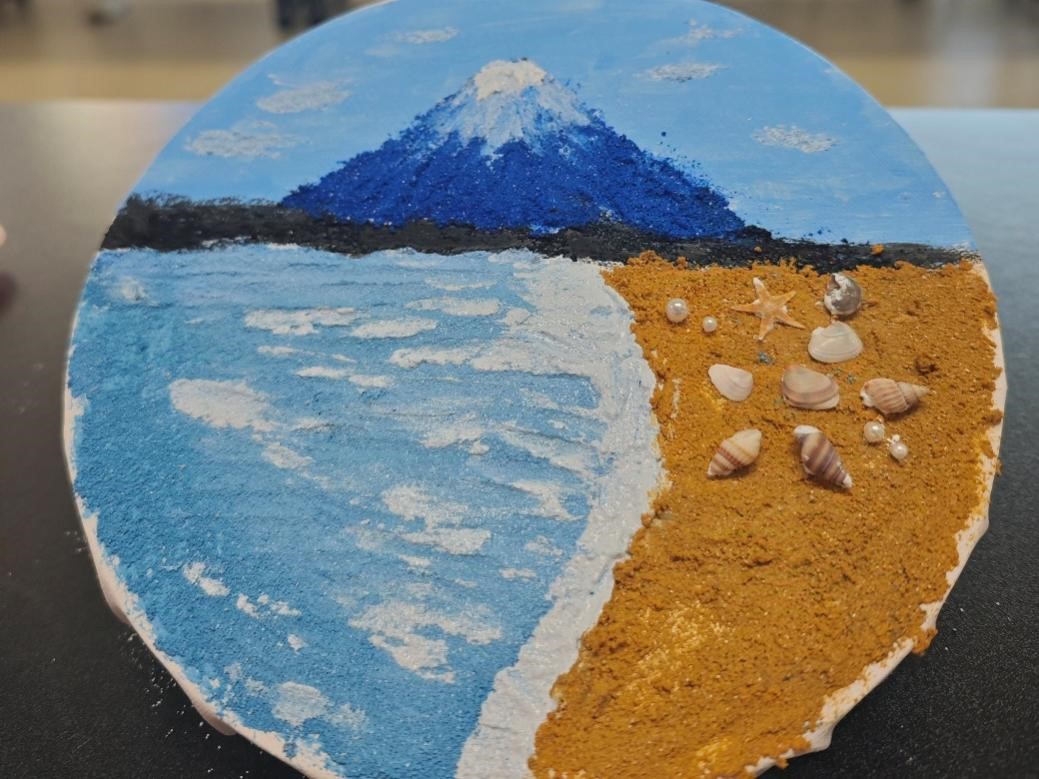 在创作过程中,现场的工作人员为大家讲解了肌理画的基本技巧并为参与者提供了贝壳,海星和珍珠作为装饰。参与者迫不及待地拿起画笔投入到制作中,有的按图临摹,有的构思创作,还有的耐心地调配出满意的颜色,充分发挥着想象力,不多时,一幅幅创意满满、各具特色、充满艺术感的石英砂肌理画呈现出来。