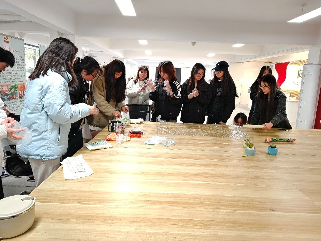 青团制作环节,是创意与美食的碰撞时刻。工作人员向参与活动的同学们详细介绍了青团的制作方法,并现场演示了和面、包馅、成型的步骤。同学们根据活动现场准备的材料青团粉、咸蛋黄、豆沙馅、肉松等,发挥自由想象,制作出独具风味的青团。这不仅是一次美食的制作,还是优秀传统文化记忆的传承。在工作人员的悉心指导下,活动现场洋溢着浓厚的实践氛围。部分同学手法娴熟,揉面、包馅一气呵成,做出的青团外形圆润饱满,尽显专业水准。而初次尝试的同学们则自发组成互助小组,你揉面我包馅,在协作中不仅完成了作品,更体会到团队合作的乐趣。最后的成品展示环节,是分享与提升的时刻,也是文化技艺的传承时刻。