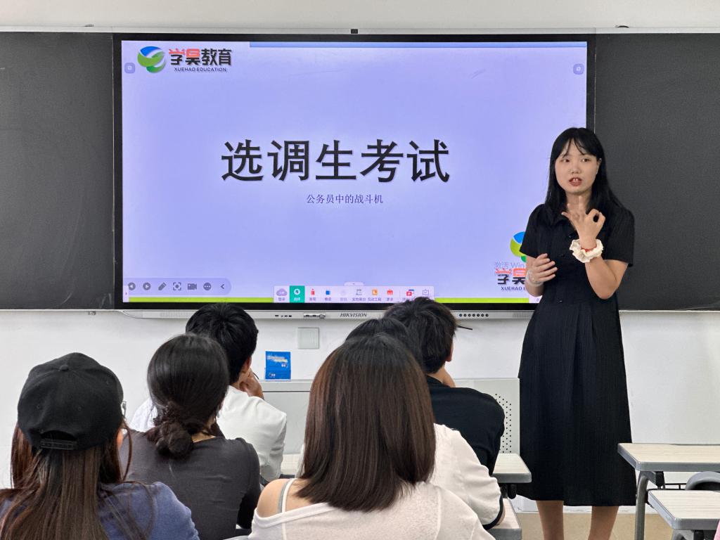 讲座中,学昊教育小果老师围绕国考、省考、选调生、事业单位及国企招聘等主流公职类考试展开深度剖析。通过清晰的考情对比表格,她系统阐释了各类考试在笔试内容、时间安排、题量设置等方面的具体差异,帮助同学们形成全面而直观的认知。针对被誉为“公务员中的战斗机”的选调生项目,小果老师进一步解读了其选拔标准、培养机制与发展优势,拓宽了同学们的择业视野。