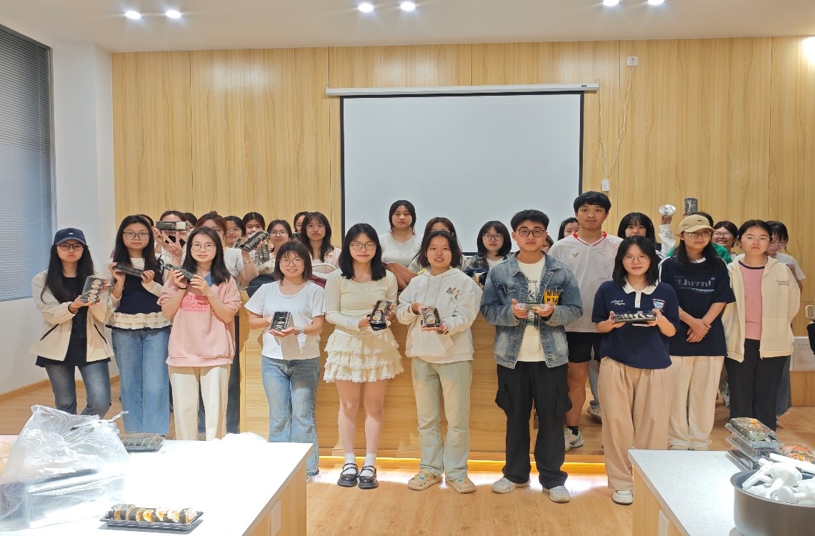 在同学们的共同努力下,形态各异的寿司诞生,同学们开心展示成果,互相品尝,分享寿司制作中的趣事与心得。活动尾声,同学们合影留念,记录美好时刻。