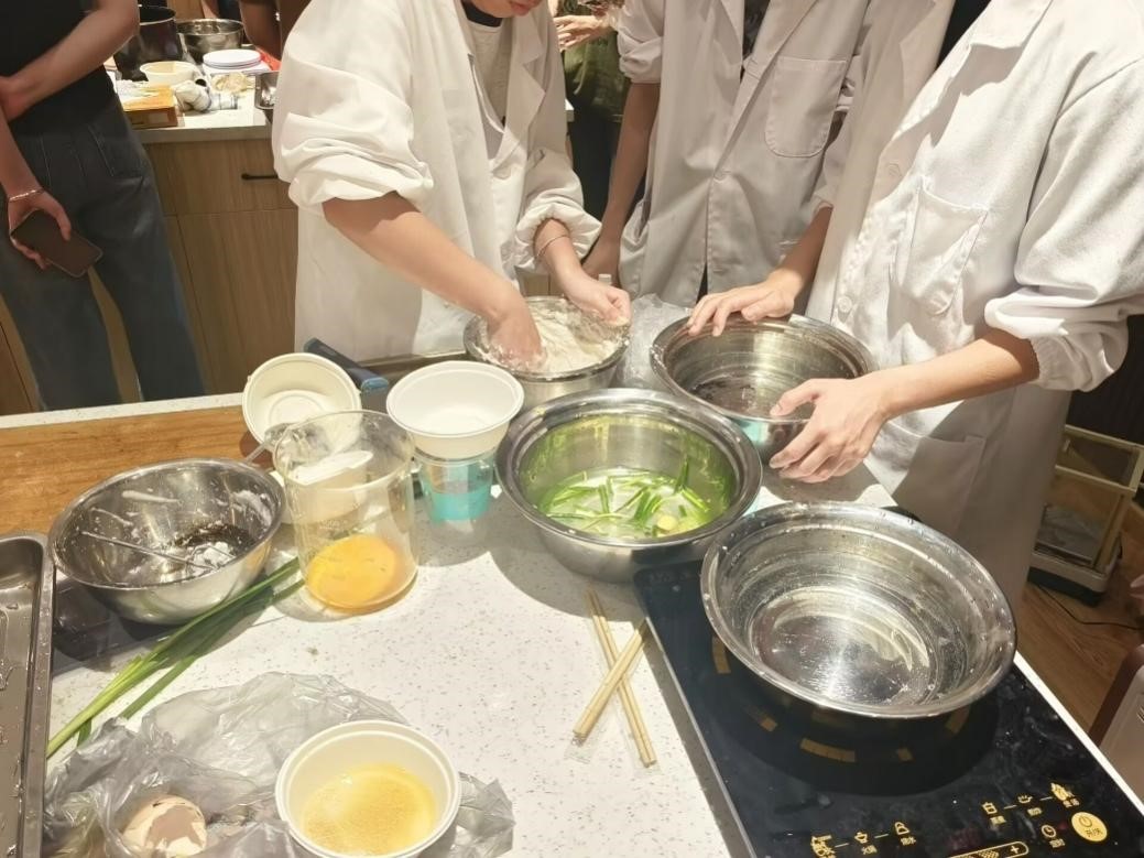 与此同时,生物实验楼108室鱼丸制作实践现场热火朝天。各团队依据指定材料与工艺,默契配合,精细处理鱼肉、精准调配辅料、反复搅打上劲、巧妙成型鱼丸并精准控制煮制火候。限时60分钟内,一颗颗色泽洁白、圆润饱满的鱼丸在巧手中诞生。评委依据感官评分标准,从工艺、色泽、弹性、鲜嫩度及味道等维度对作品进行了细致品评。