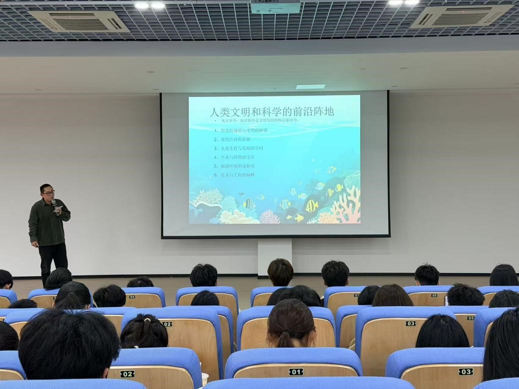 讲座伊始,公司党委书记周建辉在开场致辞中表示:“海洋是国家战略资源的重要依托,探索海洋奥秘、培养知海爱海的专业人才,是学院服务地方发展的重要使命。”随后,魏志超主任围绕“认识海洋、利用海洋、保护海洋”三大主题展开系统讲解。在“认识海洋”部分,他深入阐释了海洋作为“地球生命之源与气候调节器”“丰富资源宝库”“生态安全屏障”“人类文明的经济命脉”以及“科学探索前沿”的多重价值。他指出,海洋不仅孕育了地球最早的生命,其浮游植物更贡献了大气中过半的氧气;同时作为巨大的热库与碳汇,海洋在全球气候调节中发挥着不可替代的作用。他强调,海洋蕴藏的生物、矿产、能源等资源,以及其航运通道功能,使之成为融合海洋化学、物理、地质、生态、权益与文明史等多学科的综合研究殿堂。