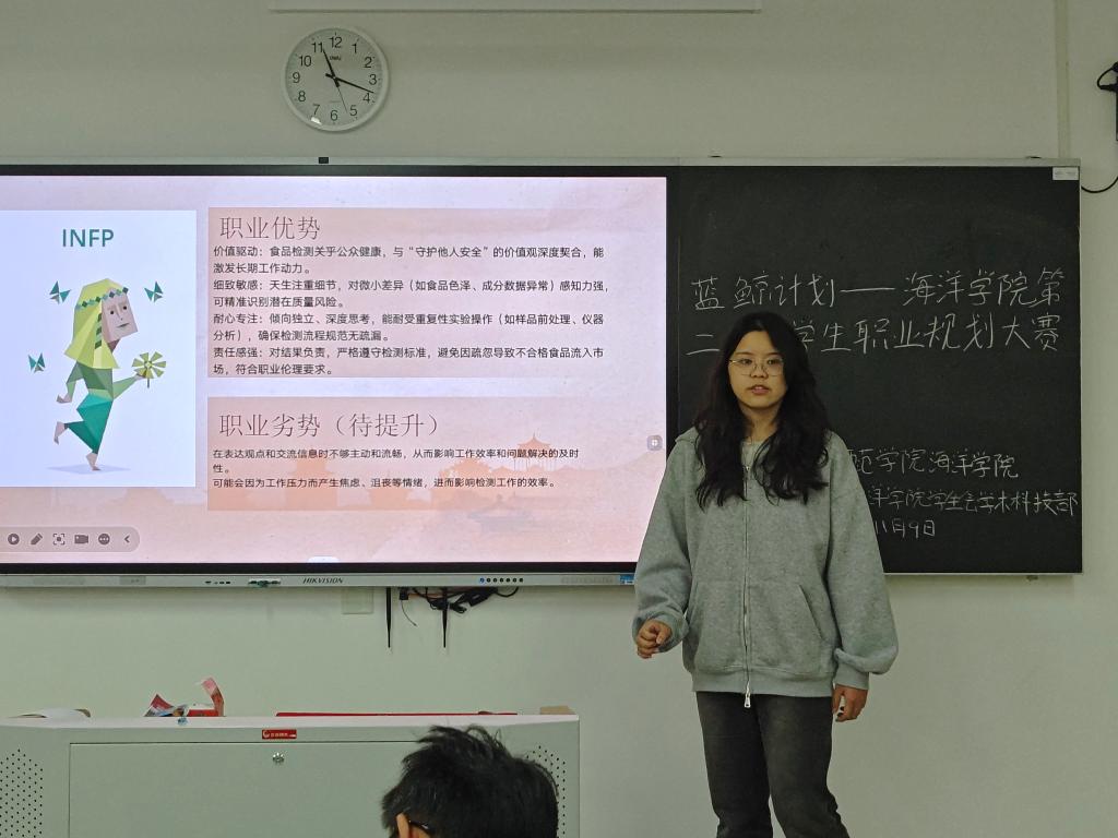 大赛现场,参赛选手紧扣“探索蓝色梦想,规划未来航程”主题,立足个人兴趣与专业特长,结合食品与海洋领域发展需求,进行了系统而全面的职业规划展示。选手们从自我认知、环境分析、职业目标定位、实施路径设计到动态评估调整,多维度阐述了个人职业愿景与发展路径。清晰的逻辑结构、饱满的展示热情以及对未来职业的深入思考,充分展现了best365中国官方网站学子扎实的专业功底与积极向上的精神风貌。