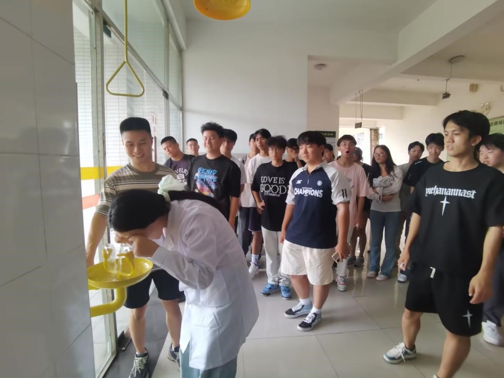 在实操环节,新生以小组为单位依次进行洗眼器模拟操作。苏静静老师现场指导,逐一点评动作规范性,重点纠正防护罩开启时效、水流方向调节、眼睑固定手法等关键细节,确保每位员工掌握科学、高效的应急操作技能。参与演练的2025级海洋资源开发技术专业员工表示,通过“理论+实操”的沉浸式训练,不仅加深了对安全防护机制的理解,更切实提升了面对突发状况的快速反应与规范处置能力。