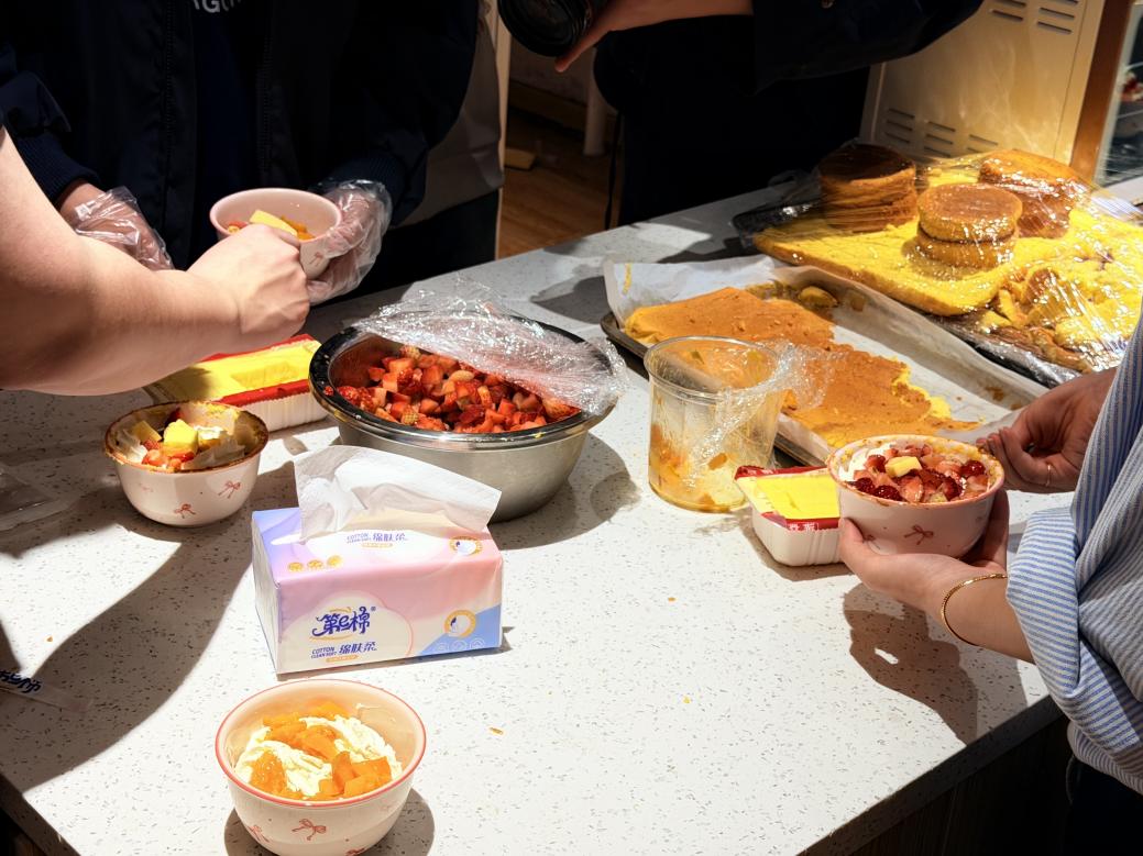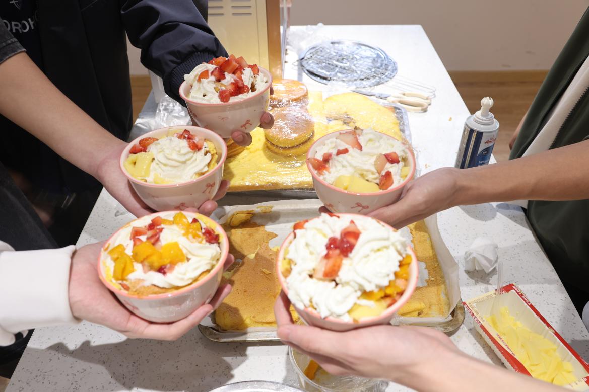 活动当晚,一站式员工社区第一园区内温馨有序,参与者陆续签到入场。工作人员围绕蛋糕装饰流程、裱花技巧、刀具安全操作等进行了细致讲解与示范。随后,同学们领取提前备好的蛋糕胚与材料包,开启独立创作之旅。涂抹奶油、搭配水果、摆放插件……大家充分发挥创意与巧思,现场欢声笑语不断。小巧精致的蛋糕碗里,奶油绵密、果香四溢,一件件风格各异、独具匠心的作品陆续诞生,劳动的成就感与分享的喜悦洋溢在每个人脸上。作品完成后,全体参与者共同展示创意蛋糕,用镜头定格甜蜜与美好,并主动清理个人操作区域,展现出良好的劳动素养。