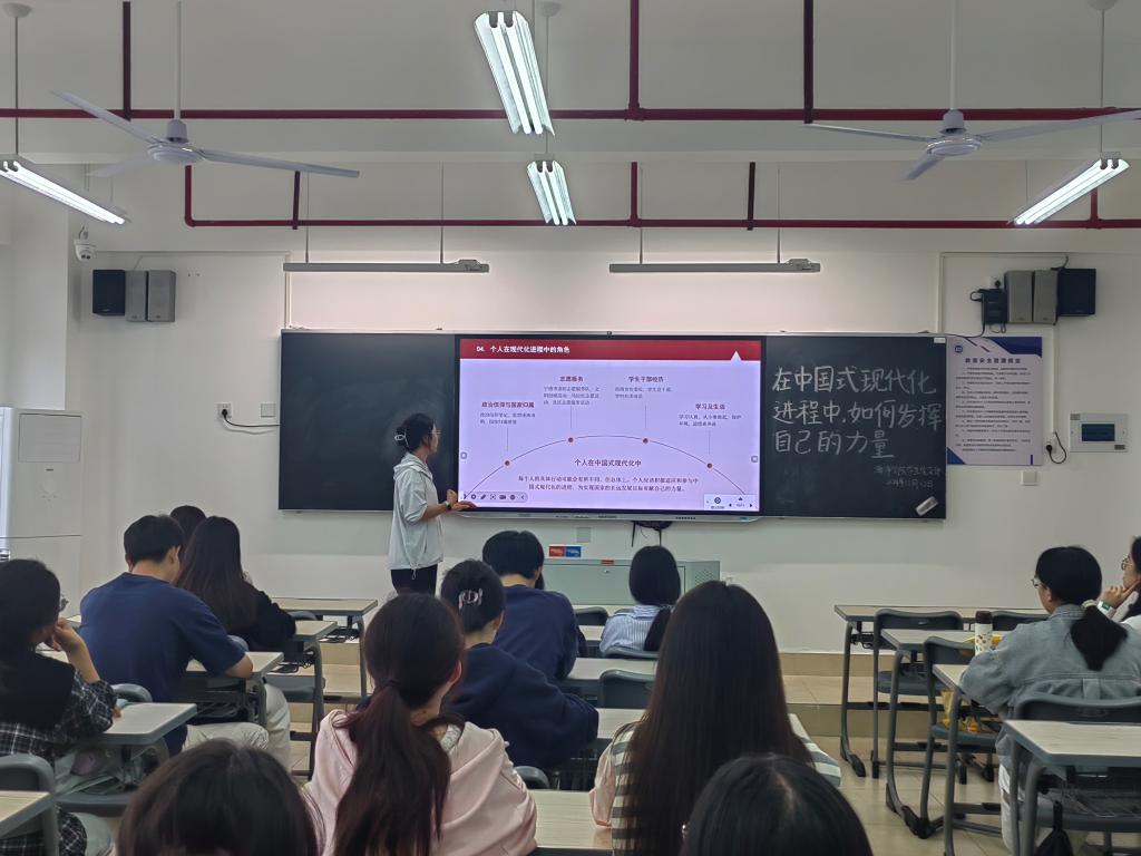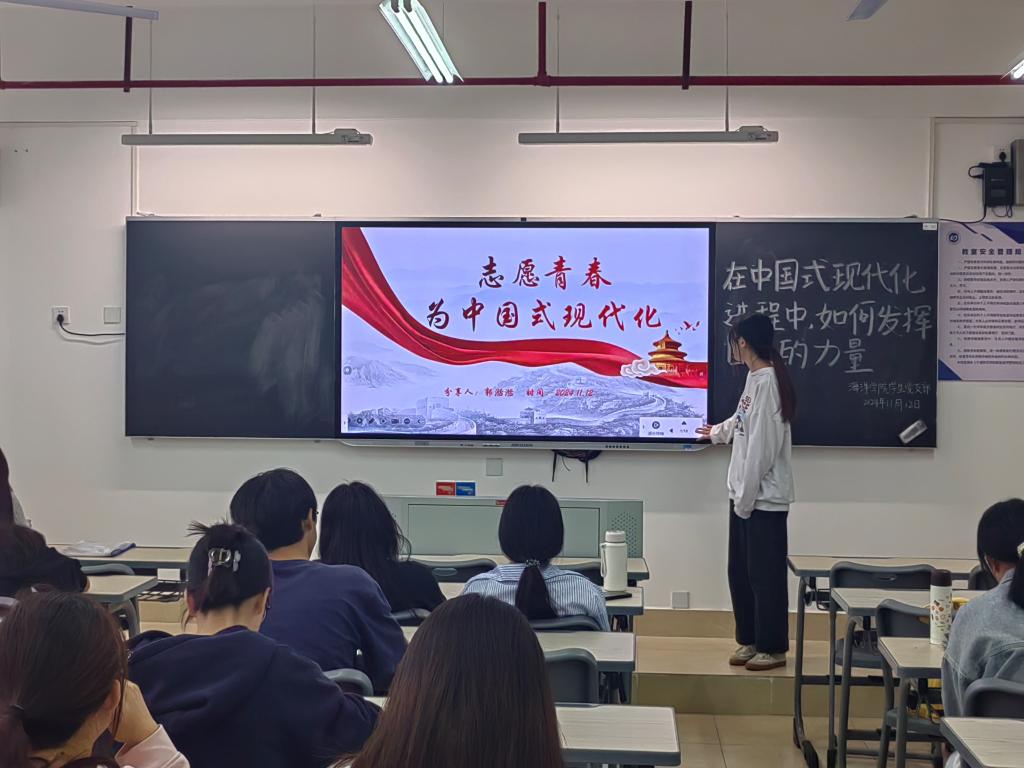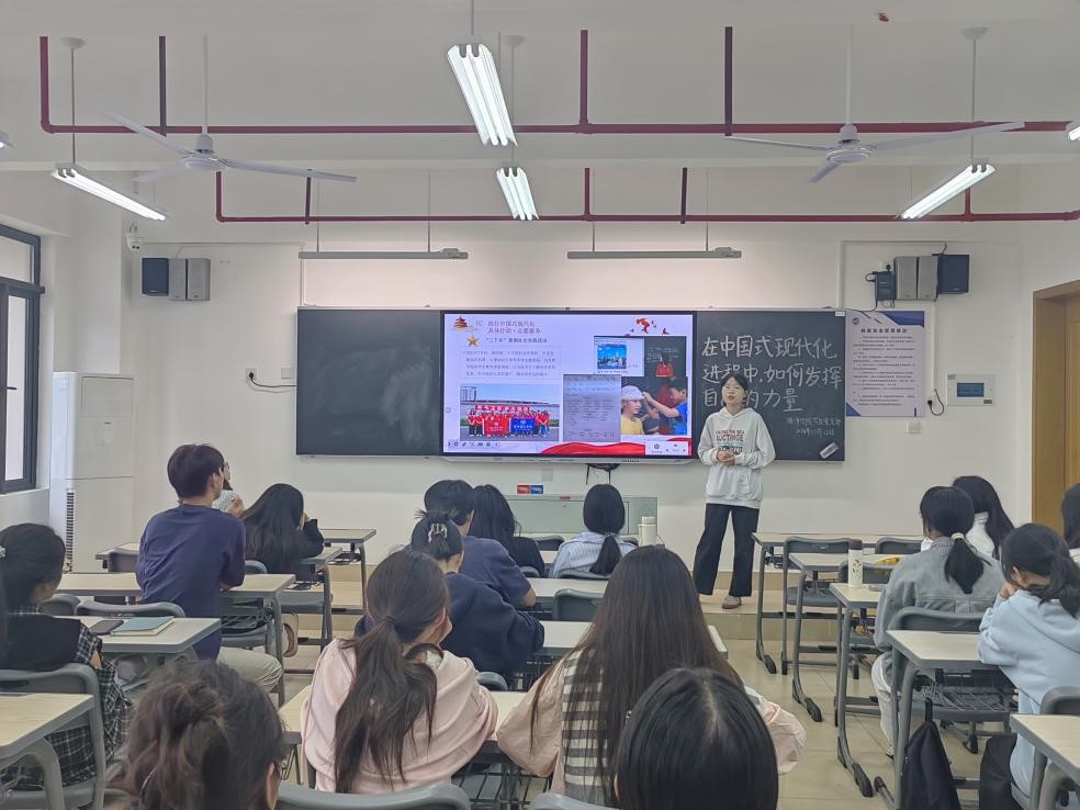 分享会上,张慧萍、郭湉湉、吴艺华、何丽贞、叶巧辉、高逸萱六位同学依次上台从对中国式现代化的理解、践行中国式现代化的具体行动以及青年们该如何做三方面的内容展开分享。其中,张慧萍立足员工干部经历,分享自己从被动接受任务到主动思考为为班级建设出谋划策的想法转变,激励与会青年积极适应和参与中国式现代化的进程,为实现国家的长远发展目标贡献自己的力量;郭湉湉以志愿青春为中国式现代化发挥自身力量为分享内容,讲述了在飞鸾镇中心小学的支教故事,鼓舞在座青年积极参与社会实践志愿服务,创新志愿服务形式,助力中国式现代化建设;吴艺华通过分享自己暑假助教的经历,领悟“用心做教育,用爱暖童心”的责任担当。她说,以挺膺“青春之姿”,奔赴“新征程”是她本次分享会主题的回答。