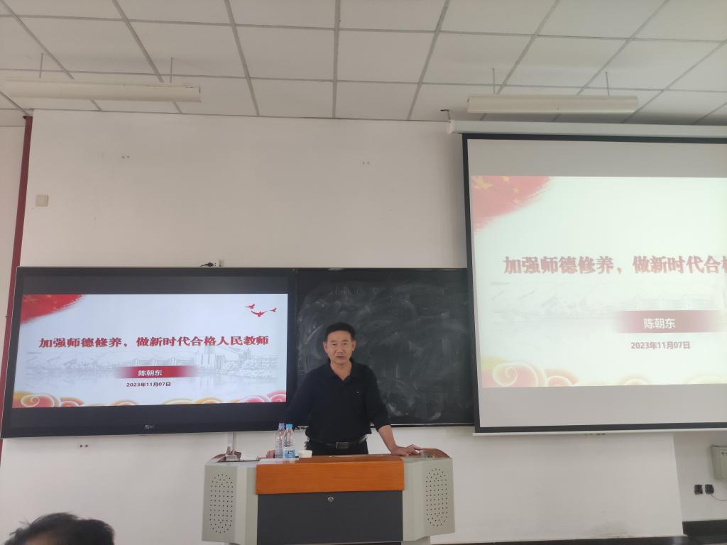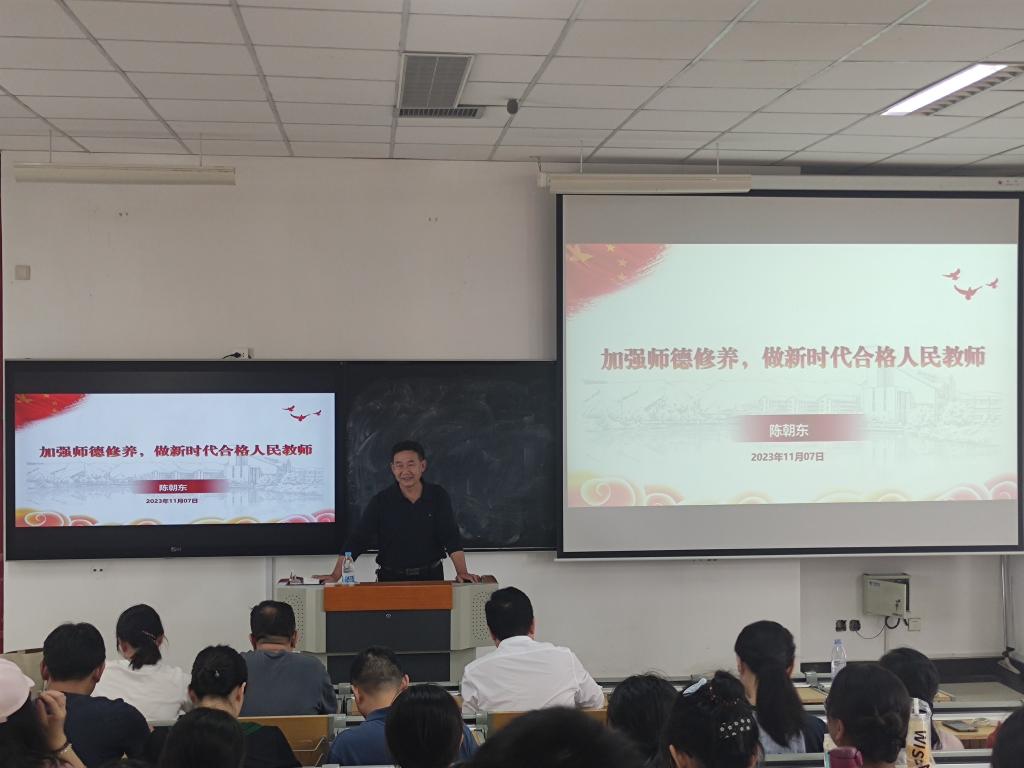 随后,陈朝东从“三爱、两仁、一终生”概括了教师职业道德的6个方面,提醒与会教师和师范生,要以教师行为准则约束自身行为,提高认识,认真学习和弘扬孔子、陶行知等优秀教育家精神,为教育事业发展作出贡献。最后,他从习近平总书记给广大教师的寄语中回答了在新的征程,要如果做一名合格的人民教师。他号召与会人员要始终坚持为党育人、为国育才的初心使命,以“四有”好老师的标准,做员工成长路上的“四个引路人”,以“躬耕教坛,强国有我”的志向和抱负,为强国建设,民族复兴贡献力量。