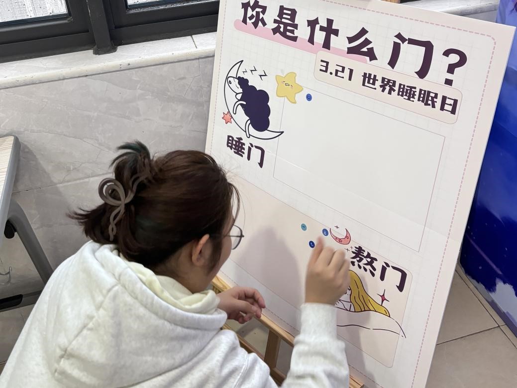 活动期间,同学们热情高涨,踊跃参与,纷纷在展板上留下个性签名,并与展板合影留念,记录下这一充满趣味的时刻。同学们还在小展板“睡眠习惯”一栏旁贴上贴纸,展示自身的睡眠习惯。不仅如此,同学们纷纷通过社交媒体分享活动照片与个人体会,进一步扩大了活动的影响力,让更多人关注到睡眠问题。