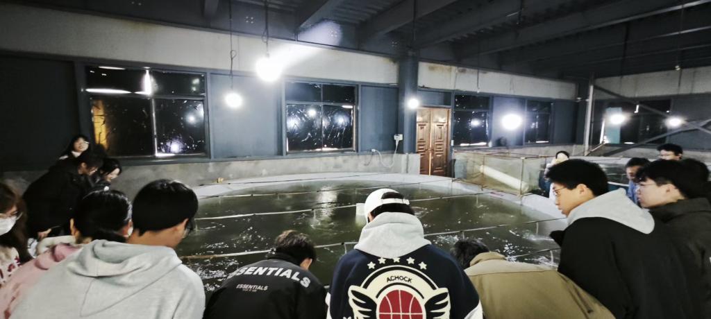 随后,师生们来到以也公司的乌鱼培育养殖基地,在技术工程师江孝泉,朱河锦,施翩等相关公司人员的带领下详细参观了解以也公司的乌鱼培育情况,培育历程与培育成就。师生们近距离观察了处于不同生长阶段的乌鱼种群和适应不同需求的乌鱼培育池,更加深刻的认识到在宁德市作为中国水产养殖重镇的行业背景下,以也公司的乌鱼培育实践不仅体现了企业技术创新的引领性,更深度融入地方海洋经济发展的战略布局。